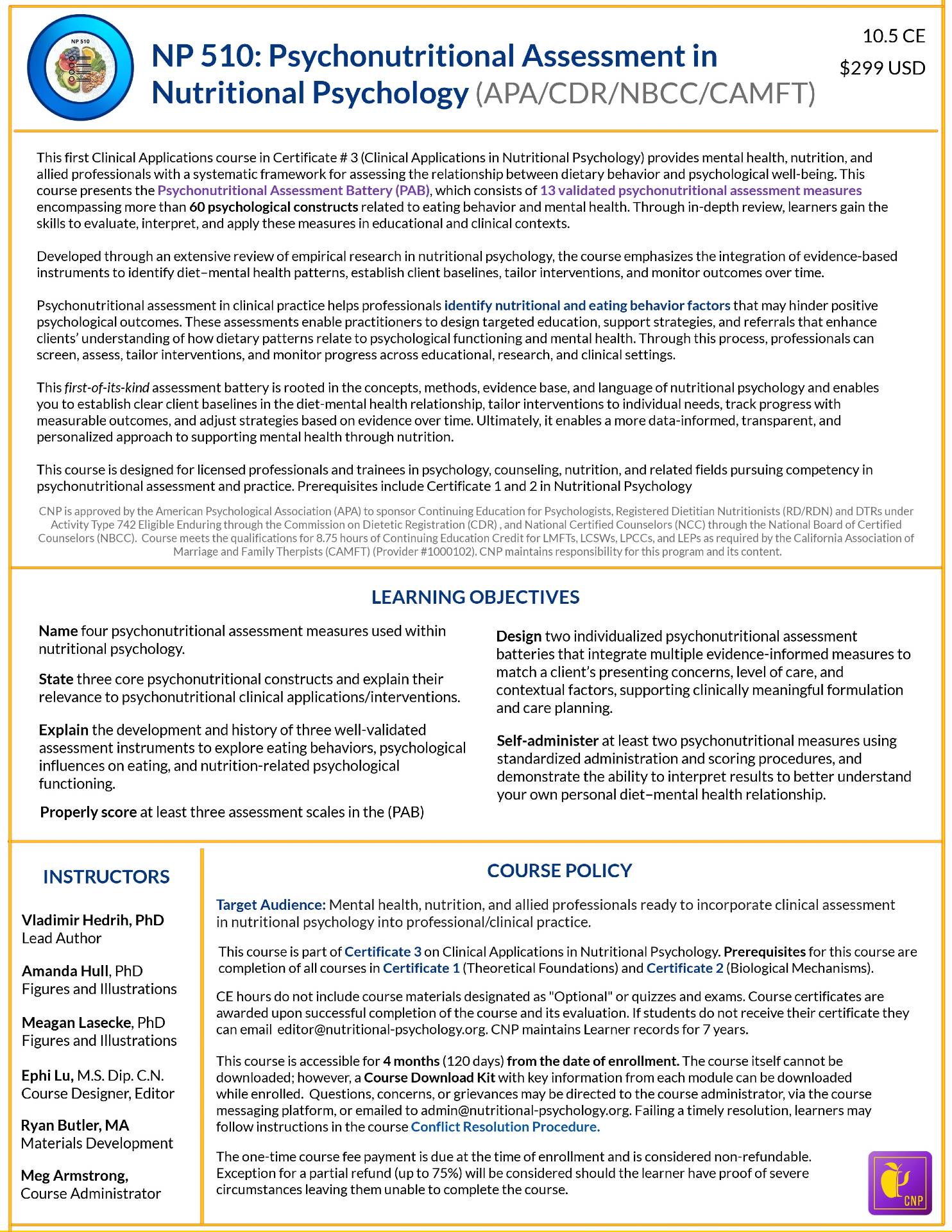 This course provides 10.5 CE for Psychologists, RDs, DTRs, LMFTs, LCSWs, LPCCs, LEPs, and National Certified Counselors (NCCs).